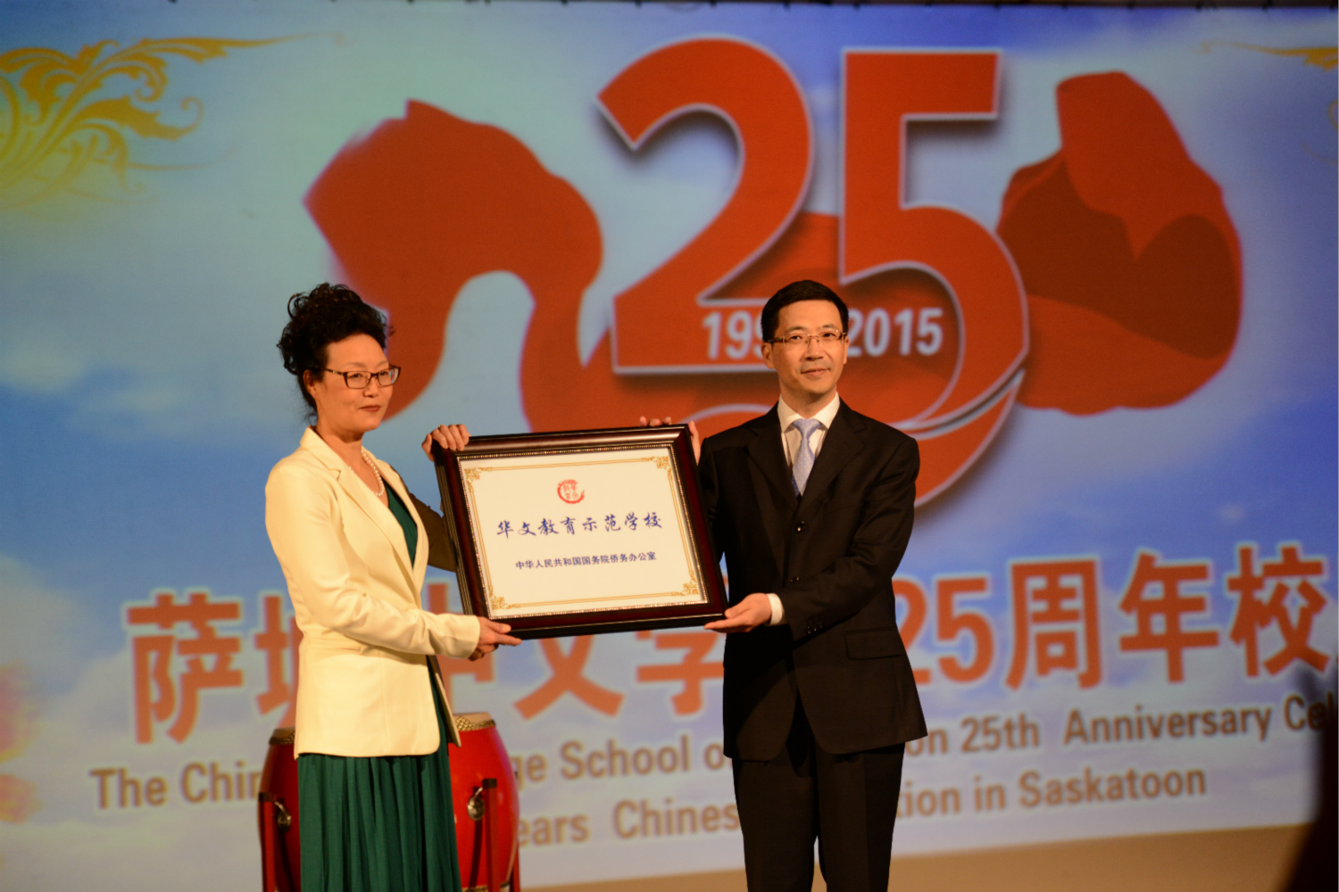 副总领事万正峰博士代表国务院侨办 向 张平晔校长 颁发 海外“华文教育示范学校”牌匾