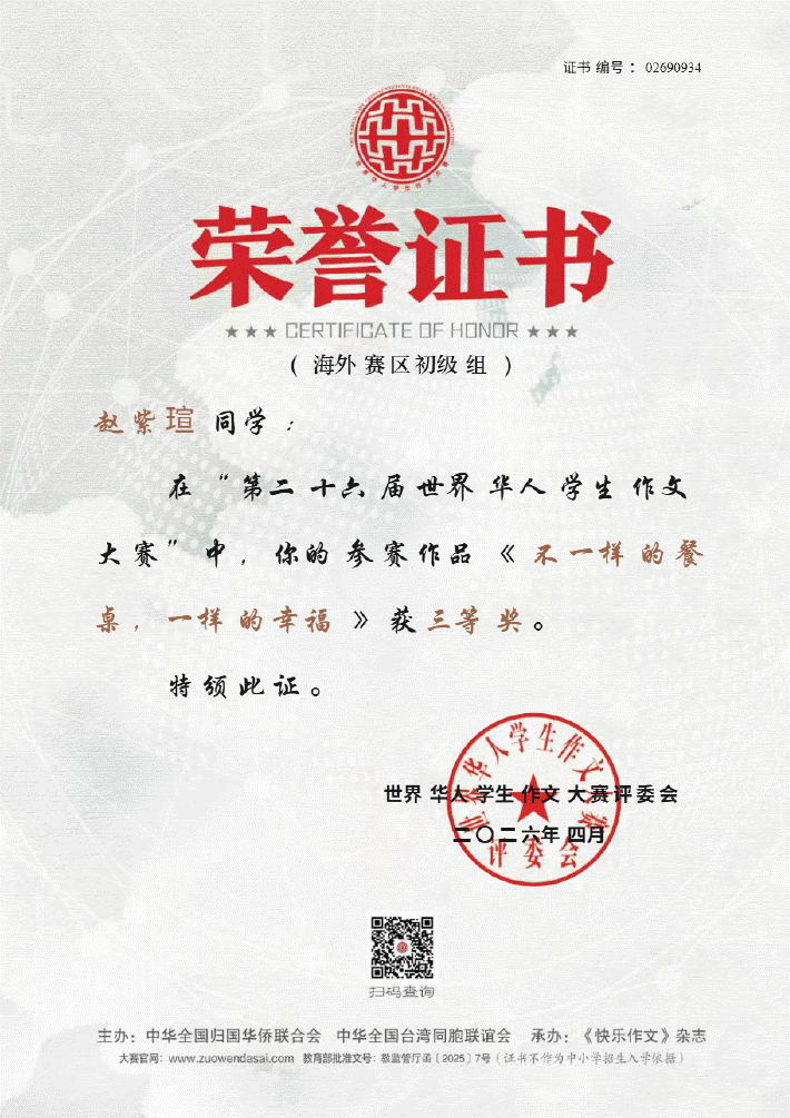 七年级赵紫瑄同学在“第二十六届世界华人学生作文大赛”中的参赛作品《 不一样的餐桌,一样的幸福 》获三等奖。