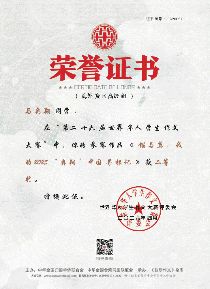 捷报: 恭贺我校毕业班马奥翔同学在“第二十六届世界华人学生作文大赛”中的参赛作品《 锚与翼:我的2025“奥翔”中国寻根记 》获二等奖。